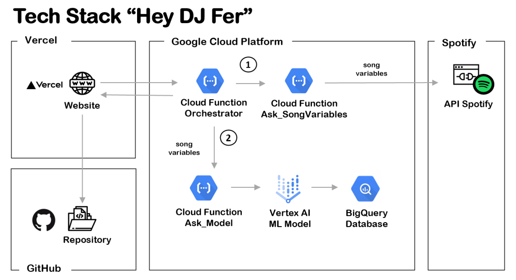 Project’s public URL: https://v0-hey-dj-fer.vercel.app/ (I’ve temporarily turned off the project’s API because I ran out of free credits on Google Cloud Platform)