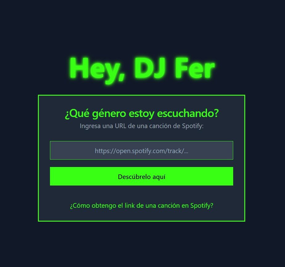 Despite my doubts, I decided to take on the challenge. The goal was relatively straightforward: build ‘Hey DJ Fer’, a fullstack web app (with both backend and frontend) that lets any Spotify user paste a song link and get a prediction of its musical genre based on my personal classification system of 50 categories. Simple concept, but with some hidden complexities.