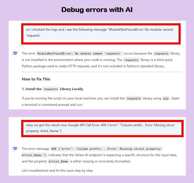 As a good product manager, intensity runs in my blood: I also want features to be in production as fast as possible. However, when facing this challenge of coding with GenAI chatbots’ help, I had to learn the virtue of patience. Indeed, I’ll warn you now that the code ChatGPT or Deepseek generates won’t work well on the first try. This happens because, no matter how much context you provide, these tools can get confused trying to respond to your request. The good news is that GenAI platforms excel at being the best allies in debugging—meaning they help you find errors in your code. Don’t think twice and pass them the error so they can advise you.