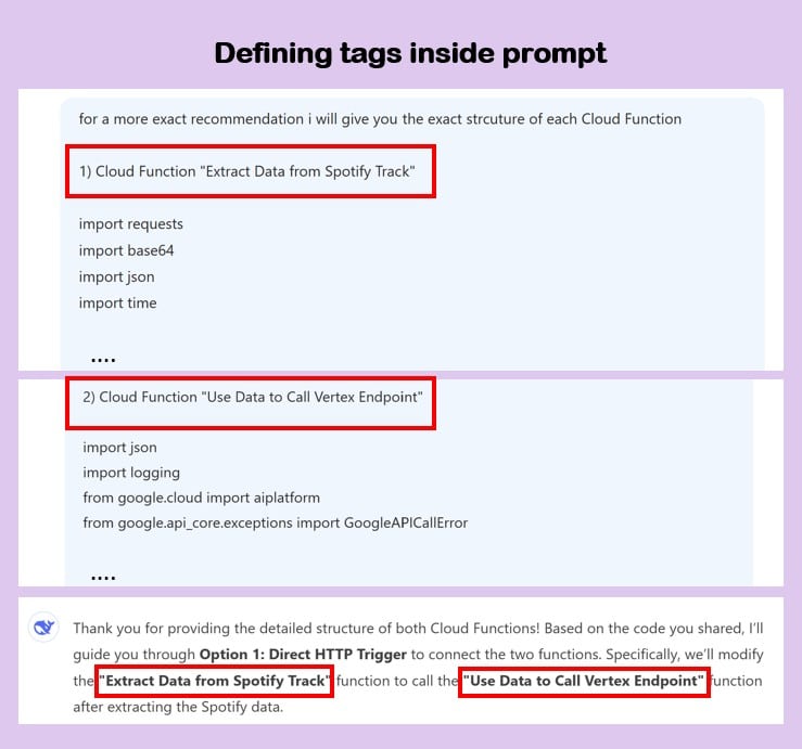 Personal example: When I had to ask for code to create an orchestrator API (one that calls several APIs at once), I decided to assign a name to each API according to the function it performed (e.g., “Extract Data From Spotify Track” and “Use Data to Call Vertex Endpoint”). This way, whenever I wanted to reference it, I only had to mention its name in the chat to make the model’s job easier.